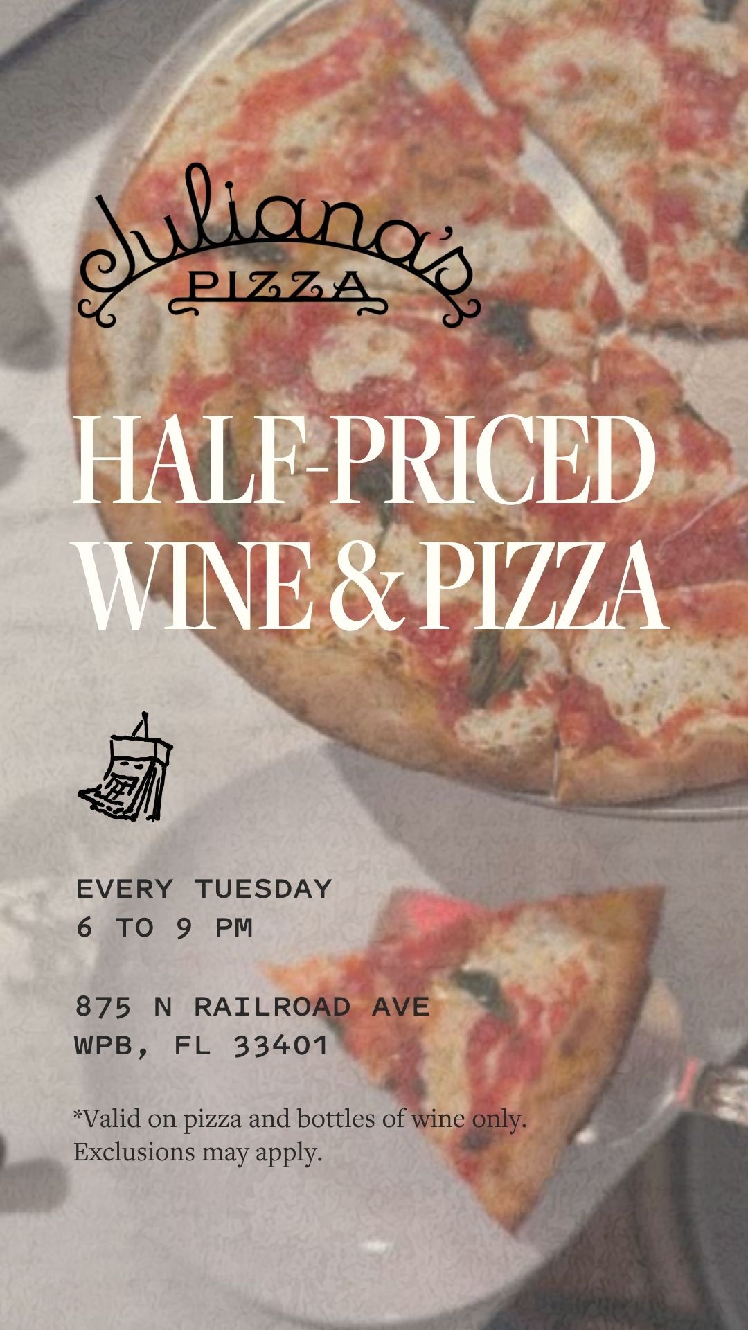 Make Tuesdays your new obsession with half-priced wine and pizza at Juliana’s in the Nora District, every week from 6-9pm. Choose from our full pizza menu and select wines to taste the best, for less.